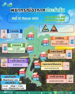 กรมอุตุนิยมวิทยา พยากรณ์อากาศ 24 ชั่วโมงข้างหน้า วันที่ 17 ธันวาคม 2568 มรสุมตะวันออกเฉียงเหนือที่พัดปกคลุมอ่าวไทย ภาคใต้ และทะเลอันดามันมีกำลังปานกลาง ทำให้ภาคใต้มีฝนลดลง แต่ยังคงมีฝนตกหนักบางแห่งบริเวณจังหวัดสงขลา ปัตตานี ยะลา และนราธิวาส ขอให้ประชาชนบริเวณภาคใต้ตอนล่างระวังอันตรายจากฝนตกหนักและฝนที่ตกสะสม ซึ่งอาจทำให้เกิดน้ำท่วมฉับพลันและน้ำป่าไหลหลาก โดยเฉพาะพื้นที่ลาดเชิงเขาใกล้ทางน้ำไหลผ่านและพื้นที่ลุ่ม ส่วนคลื่นลมบริเวณอ่าวไทยมีกำลังอ่อนลงเป็นปานกลาง โดยอ่าวไทยตอนล่างมีคลื่นสูงประมาณ 2 เมตร บริเวณที่มีฝนฟ้าคะนองคลื่นสูงมากกว่า 2 เมตร ขอให้ชาวเรือบริเวณอ่าวไทยและทะเลอันดามันเดินเรือด้วยความระมัดระวัง และหลีกเลี่ยงการเดินเรือในบริเวณที่มีฝนฟ้าคะนองตลอดช่วง สำหรับประเทศไทยตอนบนยังคงมีอากาศเย็นกับมีหมอกในตอนเช้า เนื่องจากบริเวณความกดอากาศสูงหรือมวลอากาศเย็นยังคงปกคลุมประเทศไทยตอนบนและทะเลจีนใต้ ขอให้ประชาชนดูแลรักษาสุขภาพ เนื่องจากสภาพอากาศที่หนาวเย็น และระมัดระวังในการสัญจรผ่านบริเวณที่มีหมอกไว้ด้วย ฝุ่นละอองในระยะนี้ ประเทศไทยตอนบนมีการสะสมของฝุ่นละออง/หมอกควันอยู่ในเกณฑ์ค่อนข้างน้อย เนื่องจากมีการระบายอากาศที่ดี ยกเว้นบริเวณภาคกลางตอนล่างที่มีการสะสมอยู่ในเกณฑ์ปานกลางถึงค่อนข้างมาก พยากรณ์อากาศสำหรับประเทศไทย 06:00 น. วันนี้ ถึง 06:00 น. วันพรุ่งนี้ ภาคเหนือ อากาศเย็นในตอนเช้า โดยมีฝนบางแห่ง ร้อยละ 10 ของพื้นที่ ส่วนมากบริเวณจังหวัดเชียงราย พะเยา และน่าน อุณหภูมิต่ำสุด 16-19 องศาเซลเซียส อุณหภูมิสูงสุด 28-32 องศาเซลเซียส บริเวณยอดดอยอากาศหนาวถึงหนาวจัด อุณหภูมิต่ำสุด 6-12 องศาเซลเซียส ลมตะวันออกเฉียงเหนือ ความเร็ว 10-15 กม./ชม. ภาคตะวันออกเฉียงเหนือ อากาศเย็นกับมีหมอกบางในตอนเช้า อุณหภูมิต่ำสุด 16-20 องศาเซลเซียส อุณหภูมิสูงสุด 30-33 องศาเซลเซียส บริเวณยอดภูอากาศเย็นถึงหนาว อุณหภูมิต่ำสุด 10-16 องศาเซลเซียส ลมตะวันออกเฉียงเหนือ ความเร็ว 10-20 กม./ชม. ภาคกลาง อากาศเย็นกับมีหมอกบางในตอนเช้า อุณหภูมิต่ำสุด 20-22 องศาเซลเซียส อุณหภูมิสูงสุด 32-34 องศาเซลเซียส ลมตะวันออกเฉียงเหนือ ความเร็ว 10-20 กม./ชม. ภาคตะวันออก อากาศเย็นกับมีหมอกบางในตอนเช้า อุณหภูมิต่ำสุด 21-24 องศาเซลเซียส อุณหภูมิสูงสุด 33-35 องศาเซลเซียส ลมตะวันออกเฉียงเหนือ ความเร็ว 15-35 กม./ชม. ทะเลมีคลื่นสูงประมาณ 1 เมตร ห่างฝั่งคลื่นสูง 1-2 เมตร ภาคใต้(ฝั่งตะวันออก) มีฝนฟ้าคะนอง ร้อยละ 30 ของพื้นที่ และมีฝนตกหนักบางแห่ง บริเวณจังหวัดสงขลา ปัตตานี ยะลา และน