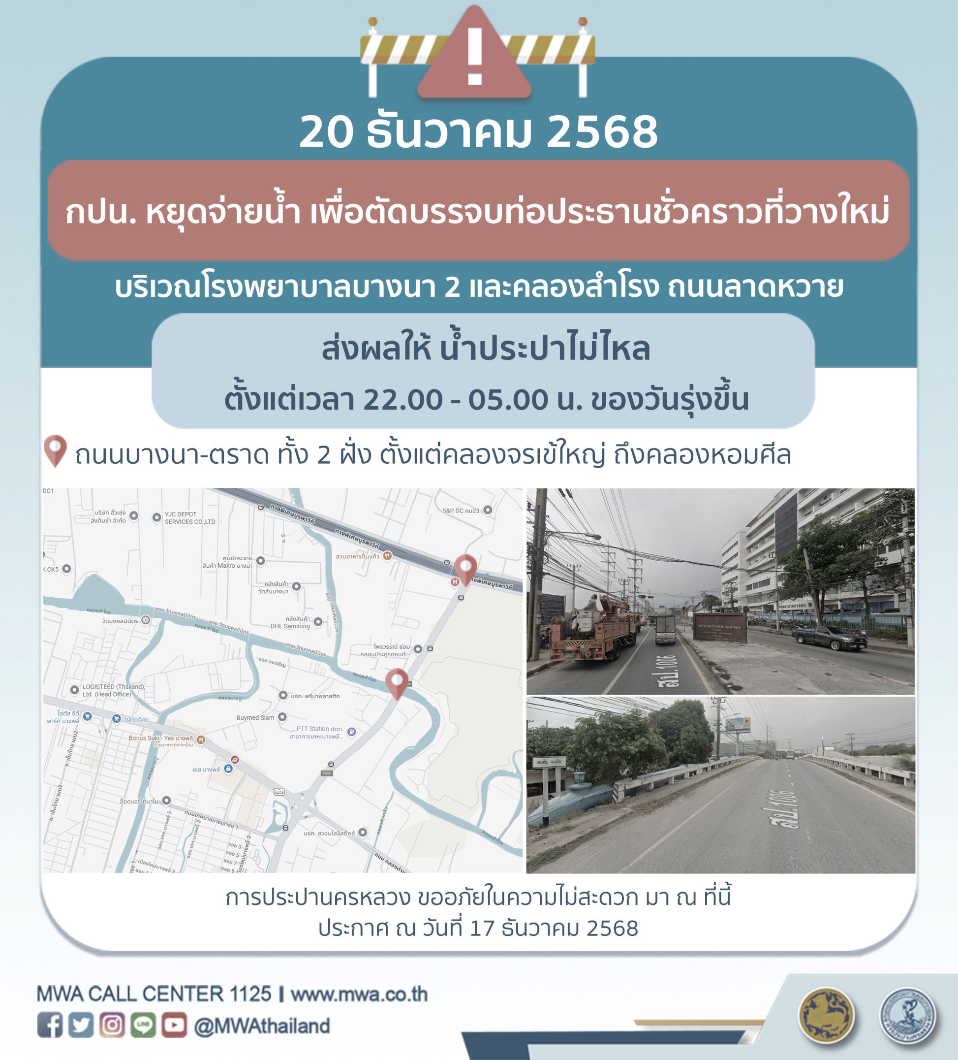 การประปานครหลวง (กปน.) ขอแจ้งให้ทราบว่า จะดำเนินการตัดบรรจบท่อประธานเดิมเข้ากับท่อประธานชั่วคราวที่วางใหม่ ในพื้นที่บริเวณโรงพยาบาลบางนา 2 และคลองสำโรง ถนนลาดหวาย เพื่อให้ประชาชนได้รับบริการน้ำประปาอย่างเพียงพอและทั่วถึง จึงมีความจำเป็นต้องหยุดจ่ายน้ำ เป็นการชั่วคราว ในคืนวันเสาร์ที่ 20 ธันวาคม 2568 ตั้งแต่เวลา 22.00 - 05.00 น. ของวันรุ่งขึ้น โดยระหว่างดำเนินการ ส่งผลให้ น้ำประปาไม่ไหล ในพื้นที่ดังต่อไปนี้