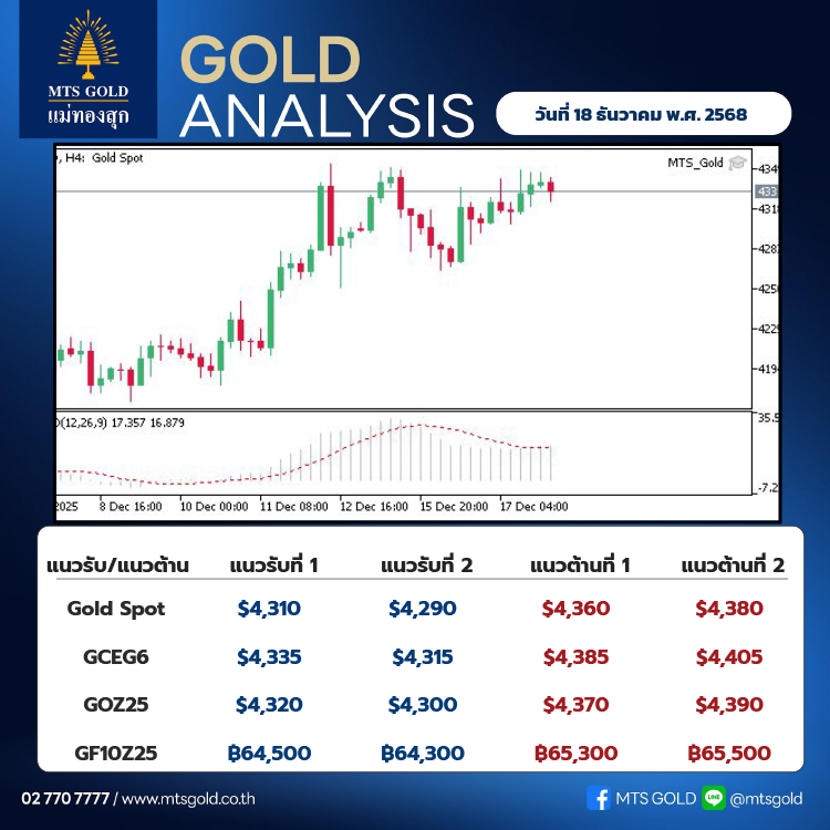 ในเชิงเทคนิค ราคาทองคำยังคงรักษาแนวโน้มหลักเป็นขาขึ้น โดยในระยะสั้นนี้มีการเคลื่อนไหวในลักษณะ "Sideway Up" แต่นักลงทุนควรเฝ้าระวังและบริหารจัดการความเสี่ยง เนื่องจากมีความผันผวนสูง และอาจมีแรงขายทำกำไรในระยะสั้น โดยภาพรวมยังมองว่าเป็นโอกาสในการย่อซื้อ ประเมินกรอบระยะสั้น แนวรับที่ 4,310-4,290 เหรียญ และแนวต้านที่ 4,360-4,380 เหรียญ ขณะที่ทองไทยจะมีแนวรับที่ 64,100 บาท และแนวต้านที่ 64,900 บาท