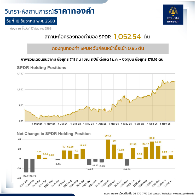 ขณะเดียวกัน ราคาน้ำมันยังคงปรับตัวลดลงอย่างต่อเนื่องตั้งแต่ช่วงต้นปี แม้ในระยะสั้นยังมีแรงกดดันจากความตึงเครียดด้านภูมิรัฐศาสตร์ ส่วนค่าเงินดอลลาร์สหรัฐแข็งค่าขึ้นเล็กน้อยราว 0.19% มาอยู่ที่ระดับ 98.39 จุด ส่งผลให้ค่าเงินบาทที่อ่อนค่าขึ้นมาเล็กน้อย ทรงตัวที่ระดับ 31.50 บาทต่อดอลลาร์ สำหรับราคาทองคำในประเทศ ปรับตัวขึ้นมาเคลื่อนไหวเหนือระดับ 64,500 บาท อีกครั้ง โดยได้รับแรงหนุนจากการอ่อนค่าของค่าเงินบาทควบคู่กับการปรับตัวขึ้นของราคาทองคำตลาดโลก ขณะที่กองทุนทองคำ SPDR วันก่อนหน้าซื้อเข้า 0.85 ตัน ปัจจุบันถือครองที่ 1,052.54 ตันภาพรวมเดือนธันวาคม ซื้อสุทธิ 7.11 ตัน ขณะที่ปีนี้ ตั้งแต่ 1 ม.ค. - ปัจจุบัน ซื้อสุทธิ 179.16 ตัน