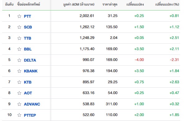 10 อันดับหลักทรัพย์ที่มีมูลค่าการซื้อขายสูงสุด