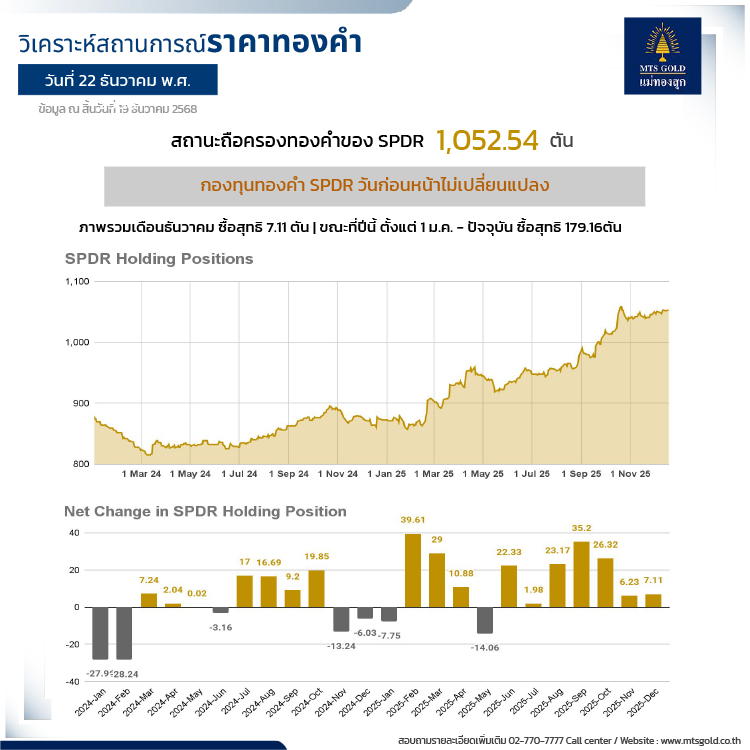 ขณะที่ด้านกองทุนทองคำ SPDR วันก่อนหน้าไม่เปลี่ยนแปลง ปัจจุบันถือครองที่ 1,052.54 ตันภาพรวมเดือนธันวาคม ซื้อสุทธิ 7.11 ตัน ขณะที่ปีนี้ ตั้งแต่ 1 ม.ค. - ปัจจุบัน ซื้อสุทธิ 179.16 ตัน