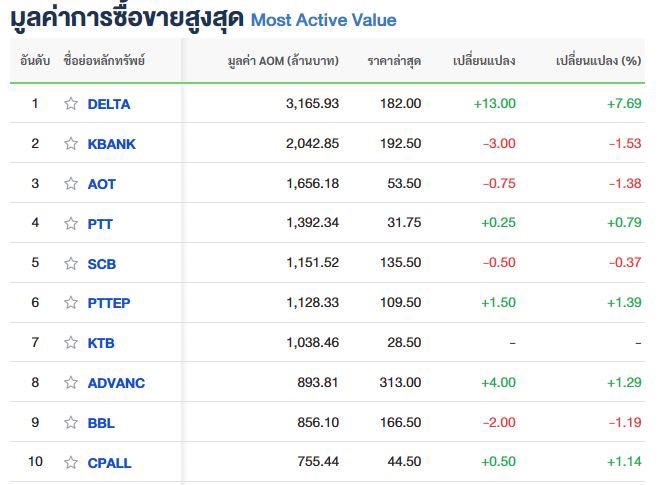10 อันดับหลักทรัพย์ที่มีมูลค่าการซื้อขายสูงสุด
