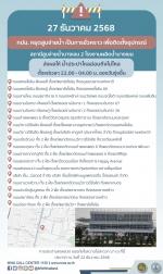การประปานครหลวง (กปน.) ขอแจ้งให้ทราบว่า จะดำเนินการติดตั้งอุปกรณ์ ในพื้นที่บริเวณโรงงานผลิตน้ำบางเขน เพื่อให้ประชาชนได้รับบริการน้ำประปาอย่างเพียงพอและทั่วถึง จึงมีความจำเป็นต้องหยุดสูบจ่ายน้ำ สถานีสูบจ่ายน้ำบางเขน 2 เป็นการชั่วคราว ในคืนวันเสาร์ที่ 27 ธันวาคม 2568 ตั้งแต่เวลา 22.00 - 04.00 น. ของวันรุ่งขึ้น โดยระหว่างดำเนินการ ส่งผลให้ น้ำประปาไหลอ่อนถึงไม่ไหล ในพื้นที่ดังต่อไปนี้