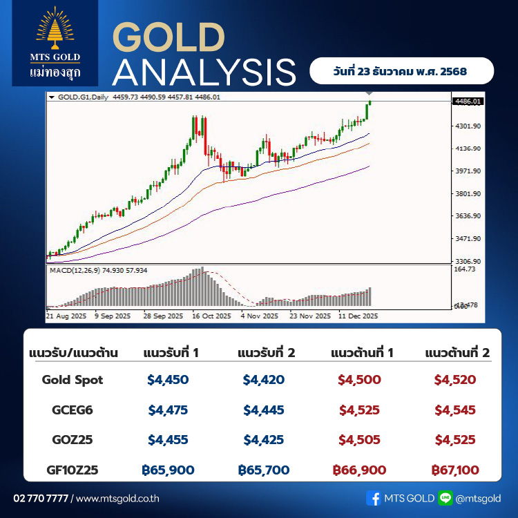 สำหรับ Gold Online Futures คาดจะมีกรอบแนวรับ 4,455 เหรียญ และแนวต้าน 4,505 เหรียญ และ Gold Comex คาดจะมีกรอบแนวรับ 4,475 เหรียญ และแนวต้าน 4,525เหรียญ Gold Futures Series V25 จะมีแนวรับที่ระดับ 65,900 บาท และแนวต้านที่ระดับ 66,900 บาท