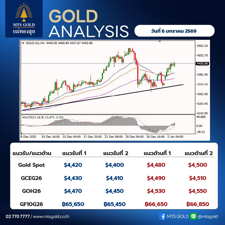สำหรับ Gold Online Futures คาดจะมีกรอบแนวรับ 4,470 เหรียญ และแนวต้าน 4,530 เหรียญ และ Gold Comex คาดจะมีกรอบแนวรับ 4,430 เหรียญ และแนวต้าน 4,490เหรียญ Gold Futures Series G26 จะมีแนวรับที่ระดับ 65,650 บาท และแนวต้านที่ระดับ 66,650 บาท