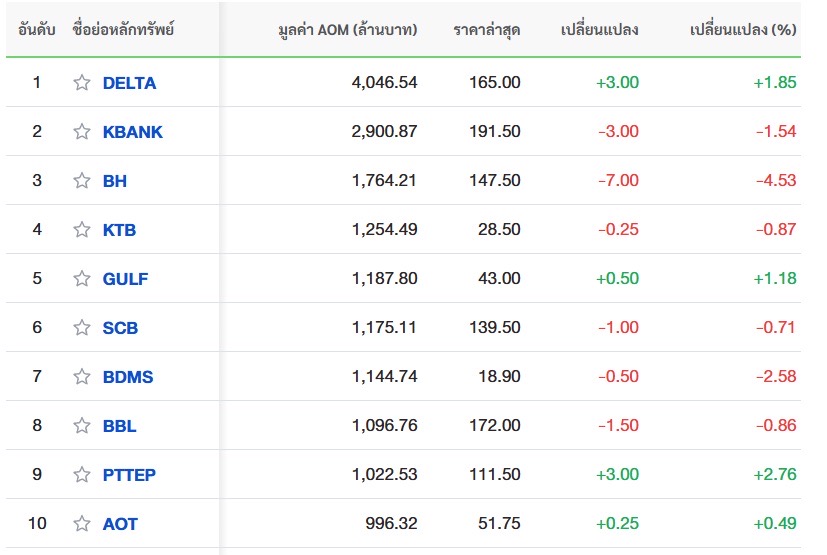 10 อันดับหลักทรัพย์ที่มีมูลค่าการซื้อขายสูงสุด