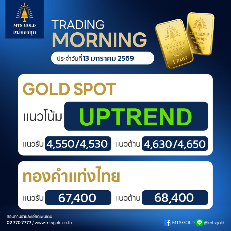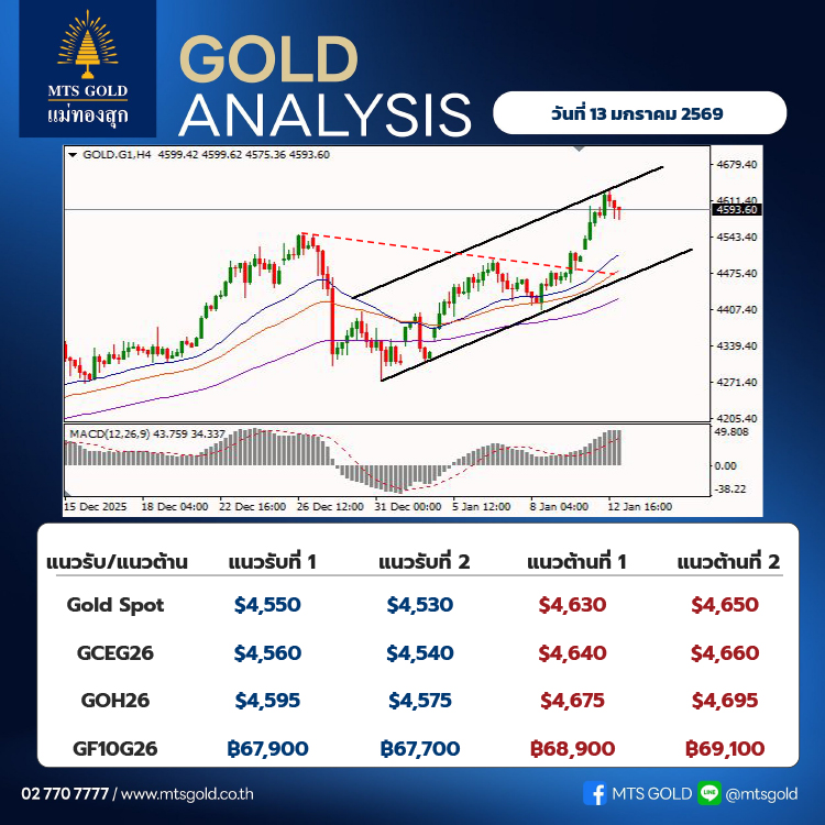 ในเชิงเทคนิค ราคาทองคำยังคงอยู่ในแนวโน้มขาขึ้น (Uptrend) อย่างชัดเจน โดยล่าสุดสามารถทำจุดสูงสุดใหม่ (New High) ได้อีกครั้ง สะท้อนแรงซื้อที่ยังแข็งแกร่ง อย่างไรก็ตาม ในระยะสั้นอาจต้องระมัดระวังแรงขายทำกำไรเป็นช่วงๆ โดยจับตาบริเวณแนวรับจากจุด Breakout เดิม ที่ระดับประมาณ 4,550 เหรียญ หากราคาสามารถย่อตัวและยืนฐานเหนือบริเวณดังกล่าวได้ จะเป็นจังหวะในการทยอยเข้าซื้อในระยะสั้น ประเมินแนวรับไว้ที่บริเวณ 4,550–4,530 เหรียญ ขณะที่แนวต้านอยู่ที่ระดับ 4,630–4,650 เหรียญ ขณะที่ทองไทยจะมีแนวรับที่ 67,400 บาท และแนวต้านที่ 68,400 บาท