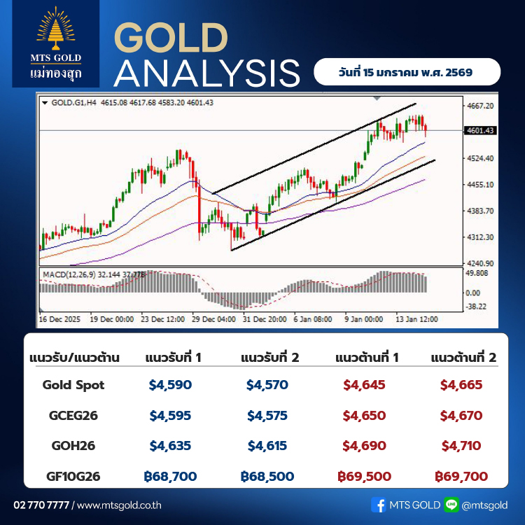 ประเมินแนวรับไว้ที่บริเวณ 4,590-4,570 เหรียญ ขณะที่แนวต้านอยู่ที่ระดับ 4,645-4,665 เหรียญ ขณะที่ทองไทยจะมีแนวรับที่ 68,200 บาท และแนวต้านที่ 69,000 บาท