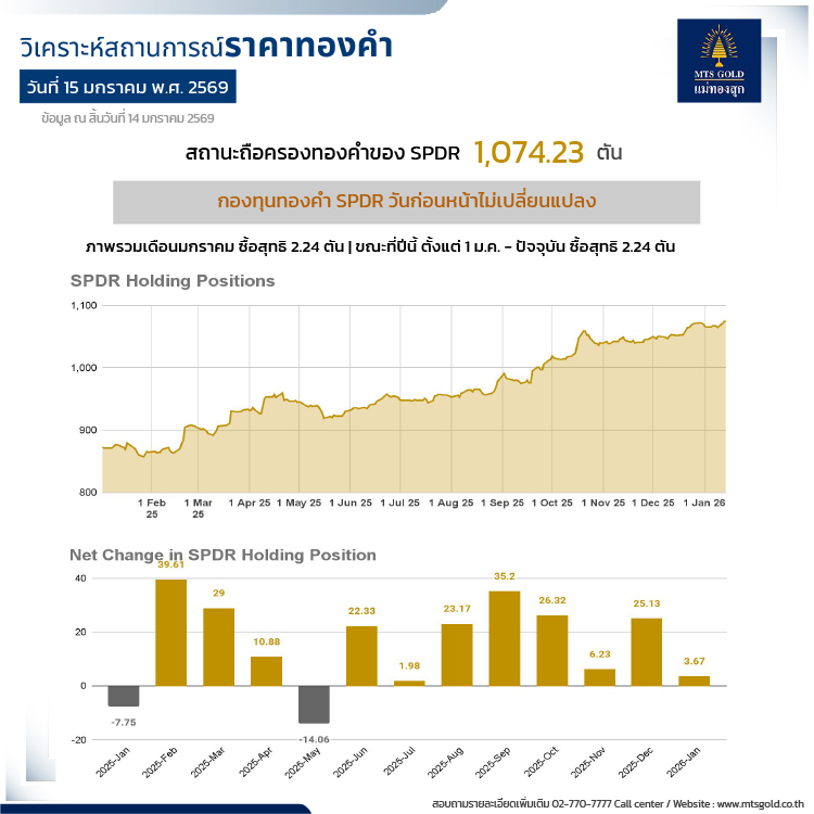 สำหรับกองทุนทองคำ SPDR วันก่อนหน้าไม่มีการเปลี่ยนแปลงการถือครอง โดยปัจจุบันถือครองทองคำที่ระดับ 1,074.23 ตัน ขณะที่ตั้งแต่ต้นปี (1 ม.ค. – ปัจจุบัน) มียอดซื้อสุทธิรวม 2.24 ตัน