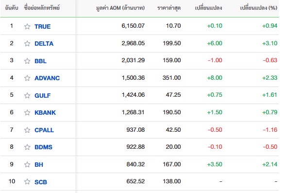 10 อันดับหลักทรัพย์ที่มีมูลค่าการซื้อขายสูงสุด