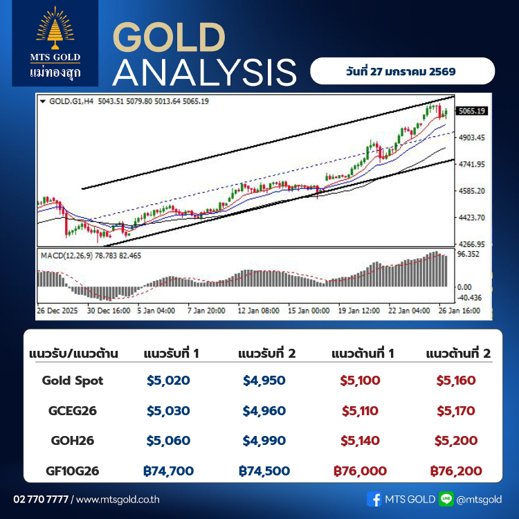 ในเชิงเทคนิค ราคาทองคำมีจังหวะย่อตัวลงมาเล็กน้อย จากแรงเทขายทำกำไร หลังเมื่อวานนี้ขึ้นไป ทำจุดสูงสุดใหม่ที่ระดับ 5,110 เหรียญ ส่งสัญญาณแนวโน้มขาขึ้นที่แข็งแกร่ง ทั้งนี้ ราคาทองคำได้ทำจุดสูงสุดใหม่ (All-Time High) ติดต่อกันหลายครั้งตั้งแต่ต้นปี ตอกย้ำโมเมนตัมเชิงบวกของตลาด สะท้อนแรงซื้อในกลุ่มโลหะมีค่าที่เพิ่มขึ้นอย่างชัดเจน อย่างไรก็ตาม จากการปรับตัวขึ้นอย่างรวดเร็วในระยะสั้น ยังคงต้องระมัดระวังแรงขายทำกำไรที่อาจสลับออกมาเป็นระยะ โดยประเมินแนวรับอยู่ที่บริเวณ 5,020-4,950 เหรียญ ขณะที่แนวต้านอยู่ที่ระดับ 5,100-5,160 เหรียญ ขณะที่ทองคำไทยมีแนวรับที่ระดับ 74,200 บาท และแนวต้านที่ระดับ 75,500 บาท