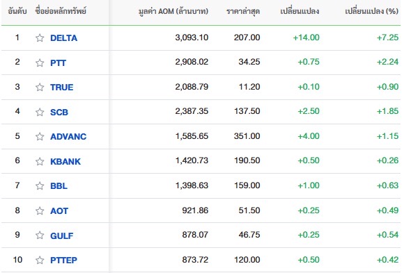 10 อันดับหลักทรัพย์ที่มีมูลค่าการซื้อขายสูงสุด