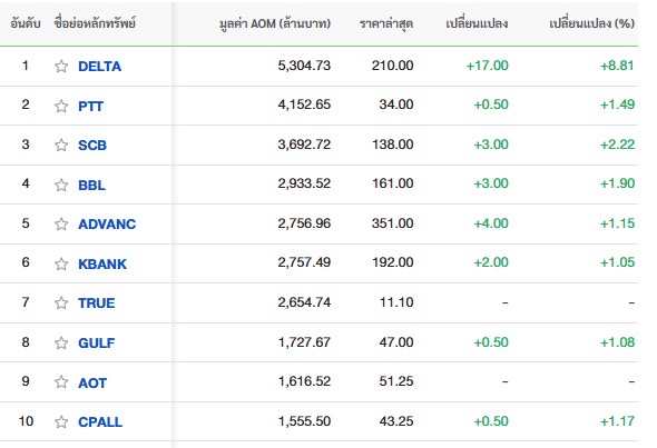 10 หลักทรัพย์ที่มีมูลค่าการซื้อขายสูงสุด