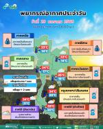กรมอุตุนิยมวิทยา พยากรณ์อากาศ 24 ชั่วโมงข้างหน้า วันที่ 29 มกราคม 2569 ประเทศไทยมีอากาศเย็นกับมีหมอกบางในตอนเช้า โดยภาคเหนือและภาคตะวันออกเฉียงเหนือยังคงมีอากาศเย็นถึงหนาว เนื่องจากบริเวณความกดอากาศสูงหรือมวลอากาศเย็นกำลังปานกลางปกคลุมที่ประเทศไทยตอนบนมีกำลังอ่อนลง ขอให้ประชาชนดูแลรักษาสุขภาพเนื่องจากสภาพอากาศที่เปลี่ยนแปลง รวมทั้งเพิ่มความระมัดระวังในการสัญจรผ่านบริเวณที่มีหมอกไว้ด้วย
