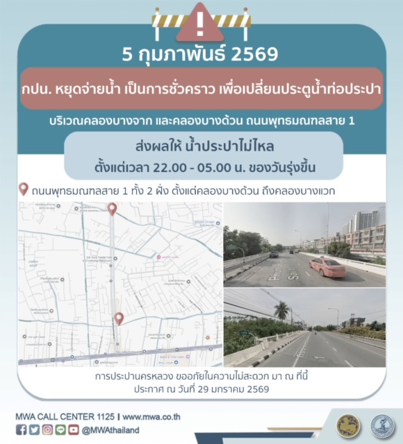 การประปานครหลวง (กปน.) ขอแจ้งให้ทราบว่า จะดำเนินการเปลี่ยนประตูน้ำท่อประปา ในพื้นที่บริเวณคลองบางจาก และคลองบางด้วน ถนนพุทธมณฑลสาย 1 เพื่อให้ประชาชนได้รับบริการน้ำประปาอย่างเพียงพอและทั่วถึง จึงมีความจำเป็นต้องหยุดจ่ายน้ำ เป็นการชั่วคราว ในคืนวันพฤหัสบดีที่ 5 กุมภาพันธ์ 2569 ตั้งแต่เวลา 22.00 - 05.00 น. ของวันรุ่งขึ้น โดยระหว่างดำเนินการ ส่งผลให้ น้ำประปาไม่ไหล ในพื้นที่ดังต่อไปนี้