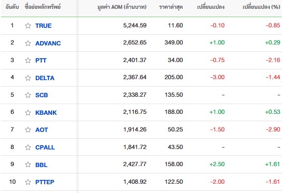 10 อันดับหลักทรัพย์ที่มีมูลค่าการซื้อขายสูงสุด