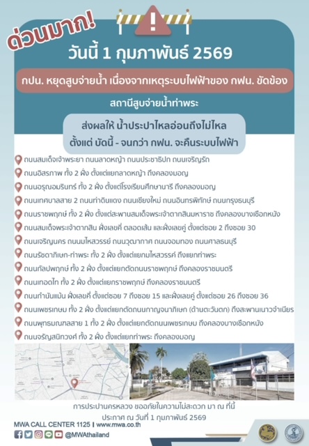 การประปานครหลวง (กปน.) ขอแจ้งให้ทราบว่า ระบบไฟฟ้าของการไฟฟ้านครหลวง (กฟน.) เกิดเหตุขัดข้อง ในพื้นที่บริเวณสถานีสูบจ่ายน้ำท่าพระ ส่งผลกระทบต่อการสูบจ่ายน้ำ สถานีสูบจ่ายน้ำท่าพระ เป็นการชั่วคราว ในวันนี้ (วันอาทิตย์ที่ 1 กุมภาพันธ์ 2569) ตั้งแต่ บัดนี้ - จนกว่า กฟน. จะคืนระบบไฟฟ้า โดยระหว่างดำเนินการ ส่งผลให้ น้ำประปาไหลอ่อนถึงไม่ไหล ในพื้นที่ดังต่อไปนี้