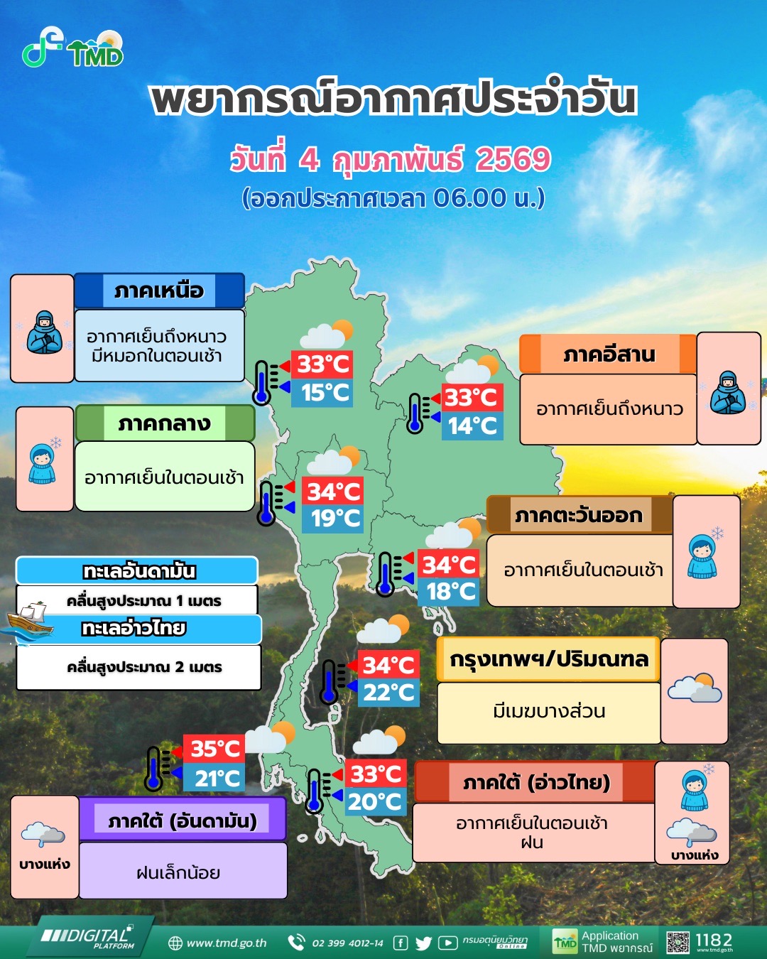 กรมอุตุนิยมวิทยา พยากรณ์อากาศ 24 ชั่วโมงข้างหน้า วันที่ 4 กุมภาพันธ์ 2569 บริเวณความกดอากาศสูงหรือมวลอากาศเย็นกำลังปานกลางถึงค่อนข้างแรงยังคงปกคลุมประเทศไทยตอนบน ลักษณะเช่นนี้ ทำให้ภาคเหนือและภาคตะวันออกเฉียงเหนือ มีอากาศเย็นถึงหนาว ส่วนภาคกลางและภาคตะวันออก มีอากาศเย็นในตอนเช้า ขอให้ประชาชนดูแลรักษาสุขภาพเนื่องจากสภาพอากาศที่เปลี่ยนแปลงไว้ด้วย
