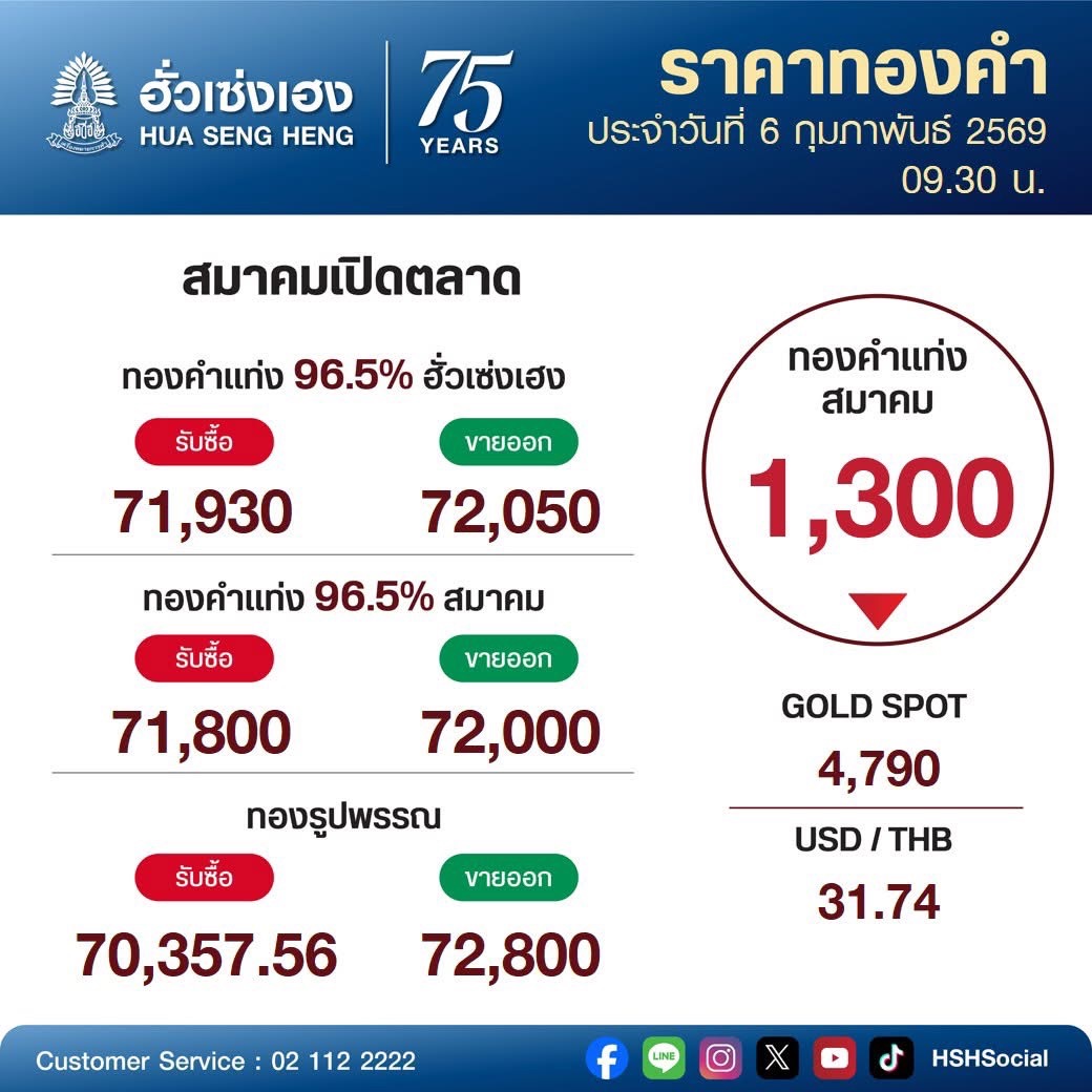 สมาคมค้าทองคำประกาศราคาทองวันนี้ (6 ก.พ. 69) ครั้งที่ 1 ปรับลดลง 1,300 บาท เทียบกับราคาปิดเมื่อวานนี้