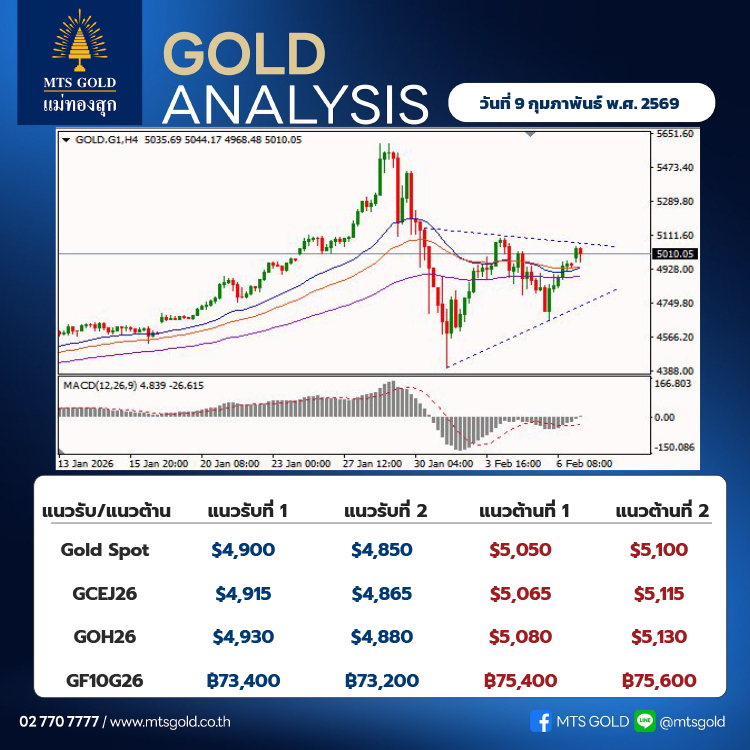 สำหรับ Gold Online Futures คาดว่าจะมีกรอบแนวรับที่ 4,930 เหรียญ และแนวต้านที่ 5,080 เหรียญ ส่วน Gold COMEX คาดว่าจะมีกรอบแนวรับที่ 4,915 เหรียญ และแนวต้านที่ 5,065 เหรียญ ขณะที่ Gold Futures Series G26 จะมีแนวรับที่ระดับ 73,400 บาท และแนวต้านที่ระดับ 75,400 บาท