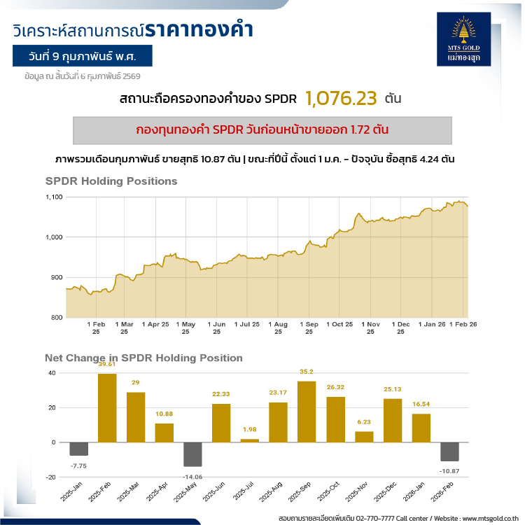 ด้านกองทุนทองคำ SPDR มีการขายทองคำออก 1.72 ตัน ส่งผลให้ปัจจุบันถือครองทองคำอยู่ที่ 1,076.23 ตัน โดยภาพรวมเดือนกุมภาพันธ์ขายสุทธิ 10.87 ตัน ขณะที่ตั้งแต่ต้นปีจนถึงปัจจุบันยังคงซื้อสุทธิ 4.24 ตัน