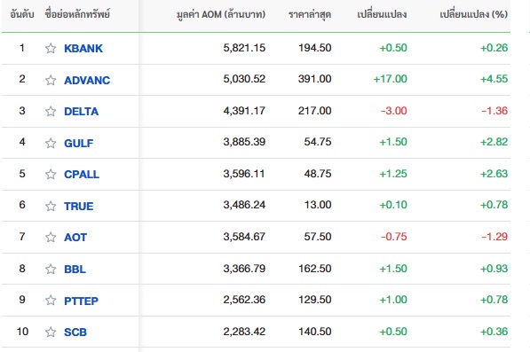 10 อันดับหลักทรัพย์ที่มีมูลค่าการซื้อขายสูงสุด