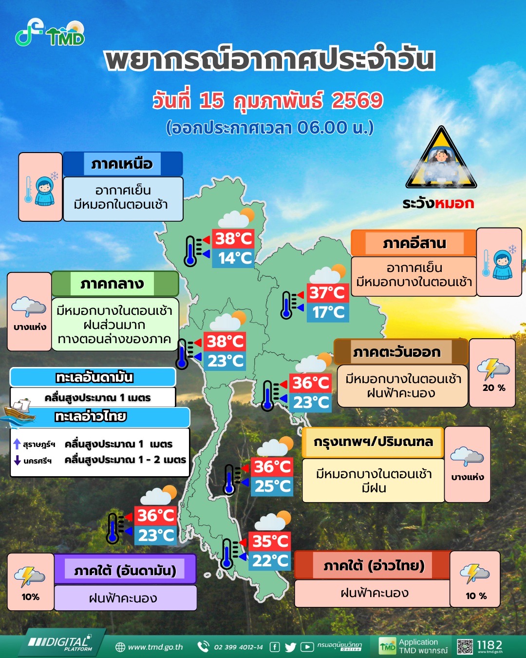 กรมอุตุนิยมวิทยา พยากรณ์อากาศ 24 ชั่วโมงข้างหน้า วันที่ 16 กุมภาพันธ์ 2569 ภาคเหนือและภาคตะวันออกเฉียงเหนือยังคงมีอากาศเย็นกับมีหมอกในตอนเช้า ส่วนภาคตะวันออก และภาคกลางรวมทั้งกรุงเทพมหานครและปริมณฑลมีฝนฟ้าคะนองบางแห่ง เนื่องจากบริเวณความกดอากาศสูงหรือมวลอากาศเย็นกำลังอ่อนปกคลุมภาคเหนือ ภาคตะวันออกเฉียงเหนือ และทะเลจีนใต้ ส่งผลทำให้มีลมตะวันออกเฉียงใต้พัดนำความชื้นจากอ่าวไทยเข้ามาปกคลุมภาคตะวันออก และภาคกลาง รวมทั้งกรุงเทพมหานครและปริมณฑล