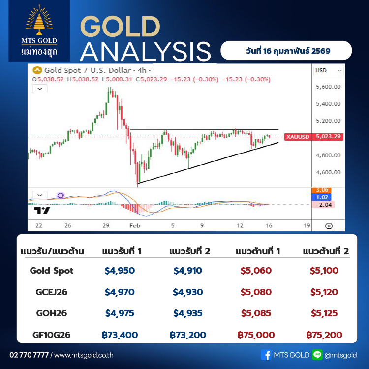 ประเมินกรอบระยะสั้นของราคาทองคำตลาดโลก (Gold Spot) แนวรับอยู่ที่บริเวณ 4,950–4,910 เหรียญ ขณะที่แนวต้านอยู่ที่ระดับ 5,060–5,100 เหรียญส่วนราคาทองคำในประเทศ ประเมินแนวรับอยู่ที่ระดับ 73,000 บาท และแนวต้านที่ระดับ 74,600 บาท