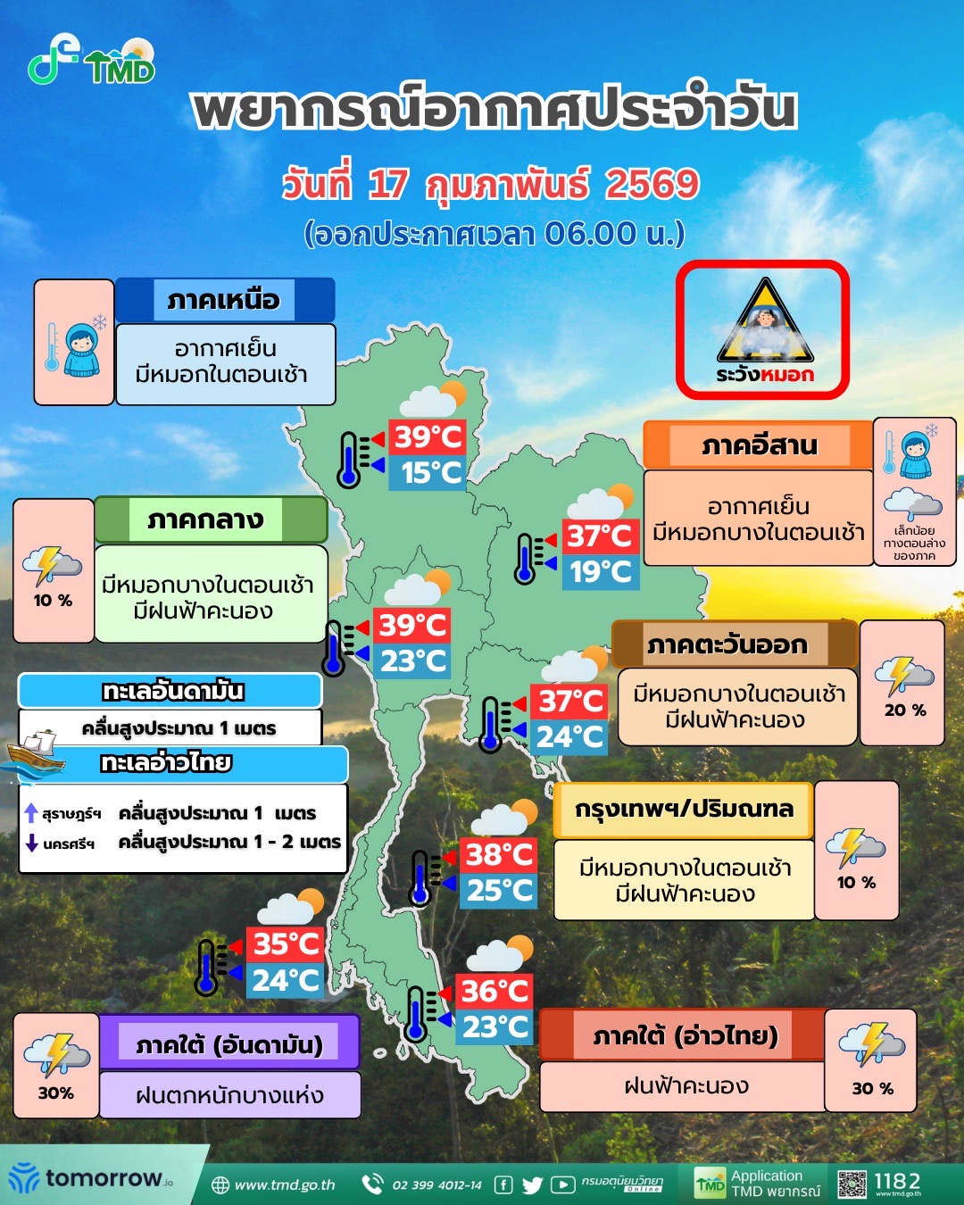 กรมอุตุนิยมวิทยา พยากรณ์อากาศ 24 ชั่วโมงข้างหน้า วันที่ 17 กุมภาพันธ์ 2569 ภาคเหนือและภาคตะวันออกเฉียงเหนือยังคงมีอากาศเย็นกับมีหมอกในตอนเช้า ส่วนภาคตะวันออก และภาคกลาง รวมทั้งกรุงเทพมหานครและปริมณฑลมีฝนฟ้าคะนองบางแห่ง เนื่องจากบริเวณความกดอากาศสูงหรือมวลอากาศเย็นกำลังอ่อนปกคลุมภาคเหนือ ภาคตะวันออกเฉียงเหนือ และทะเลจีนใต้ ส่งผลทำให้มีลมตะวันออกเฉียงใต้พัดนำความชื้นจากอ่าวไทยเข้ามาปกคลุมภาคตะวันออกเฉียงเหนือตอนล่าง ภาคตะวันออก และภาคกลาง รวมทั้งกรุงเทพมหานครและปริมณฑล ขอให้ประชาชนบริเวณประเทศไทยตอนบนดูแลรักษาสุขภาพเนื่องจากสภาพอากาศที่เปลี่ยนแปลง รวมทั้งเพิ่มความระมัดระวังในการสัญจรผ่านบริเวณที่มีหมอกไว้ด้วย