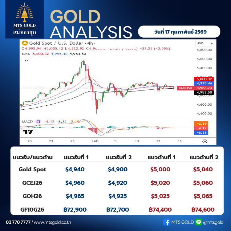 ประเมินกรอบระยะสั้นของราคาทองคำตลาดโลก (Gold Spot) แนวรับอยู่ที่บริเวณ 4,940–4,900 เหรียญ ขณะที่แนวต้านอยู่ที่ระดับ 5,000–5,040 เหรียญ ส่วนราคาทองคำในประเทศ ประเมินแนวรับอยู่ที่ระดับ 72,500 บาท และแนวต้านที่ระดับ 74,000 บาท