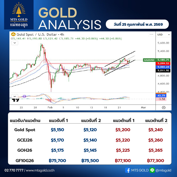 สำหรับ Gold Online Futures คาดว่าจะมีแนวรับที่ 5,175 เหรียญ และแนวต้านที่ 5,225 เหรียญ ส่วน Gold COMEX คาดว่าจะมีแนวรับที่ 5,170 เหรียญ และแนวต้านที่ 5,220 เหรียญ ขณะที่ Gold Futures Series G26 จะมีแนวรับที่ระดับ 75,700 บาท และแนวต้านที่ระดับ 77,100 บาท