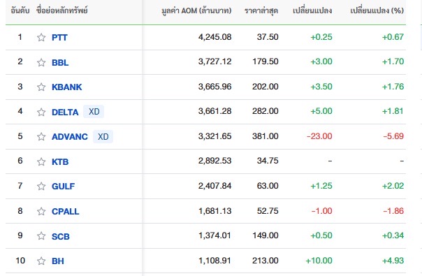 10 อันดับหลักทรัพย์ที่มีมูลค่าการซื้อขายสูงสุด