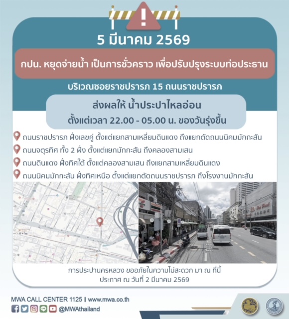การประปานครหลวง (กปน.) ขอแจ้งให้ทราบว่า จะดำเนินการปรับปรุงระบบท่อประธาน ในพื้นที่บริเวณซอยราชปรารภ 15 ถนนราชปรารภ เพื่อให้ประชาชนได้รับบริการน้ำประปาอย่างเพียงพอและทั่วถึง จึงมีความจำเป็นต้องหยุดจ่ายน้ำ เป็นการชั่วคราว ในคืนวันพฤหัสบดีที่ 5 มีนาคม 2569 ตั้งแต่เวลา 22.00 - 05.00 น. ของวันรุ่งขึ้น โดยระหว่างดำเนินการ ส่งผลให้ น้ำประปาไหลอ่อน ในพื้นที่ดังต่อไปนี้