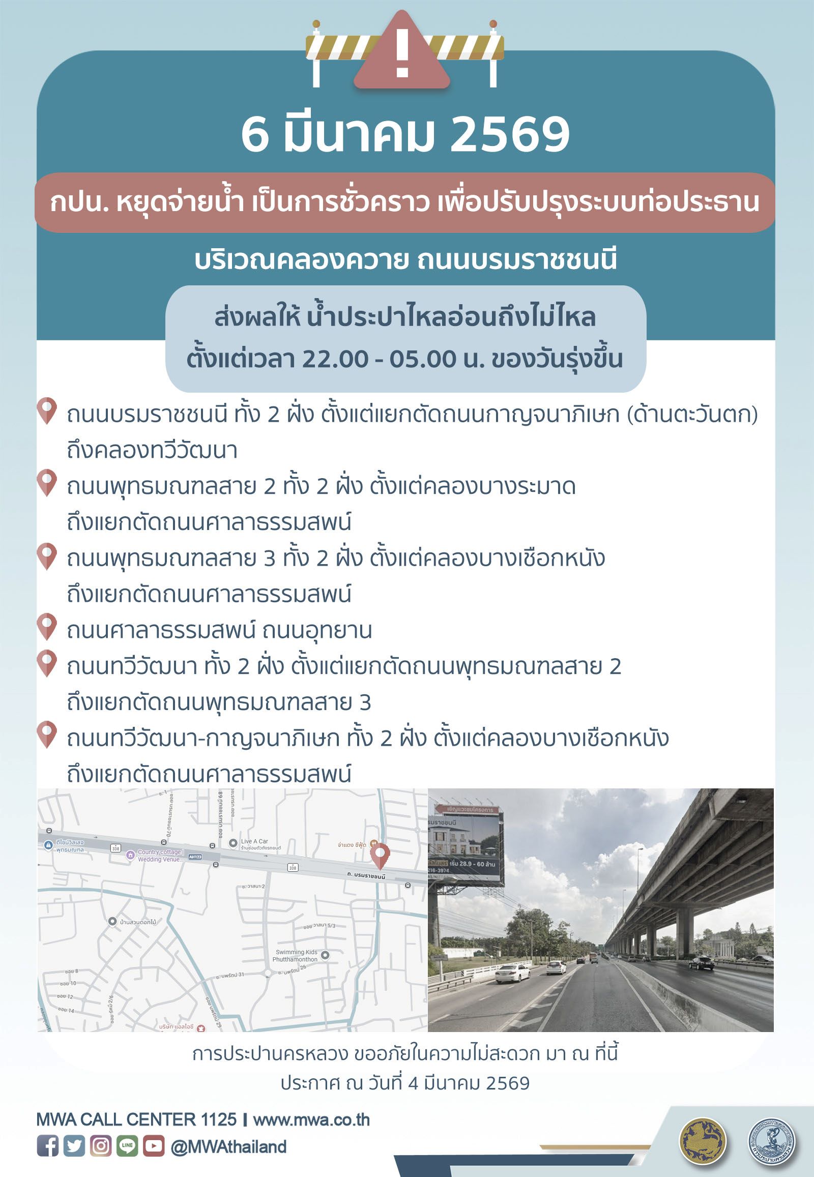 การประปานครหลวง (กปน.) ขอแจ้งให้ทราบว่า จะดำเนินการปรับปรุงระบบท่อประธาน ในพื้นที่บริเวณคลองควาย ถนนบรมราชชนนี เพื่อให้ประชาชนได้รับบริการน้ำประปาอย่างเพียงพอและทั่วถึง จึงมีความจำเป็นต้องหยุดจ่ายน้ำ เป็นการชั่วคราว ในคืนวันศุกร์ที่ 6 มีนาคม 2569 ตั้งแต่เวลา 22.00 - 05.00 น. ของวันรุ่งขึ้น โดยระหว่างดำเนินการ ส่งผลให้ น้ำประปาไหลอ่อนถึงไม่ไหล ในพื้นที่ดังต่อไปนี้