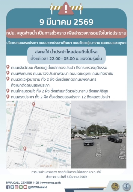 การประปานครหลวง (กปน.) ขอแจ้งให้ทราบว่า จะดำเนินการสำรวจหารอยรั่วในท่อประธาน ในพื้นที่บริเวณถนนสรงประภา ถนนนาวงประชาพัฒนา ถนนวัดเวฬุวนาราม และถนนเดชะตุงคะ เพื่อให้ประชาชนได้รับบริการน้ำประปาอย่างเพียงพอและทั่วถึง จึงมีความจำเป็นต้องหยุดจ่ายน้ำ เป็นการชั่วคราว ในคืนวันจันทร์ที่ 9 มีนาคม 2569 ตั้งแต่เวลา 22.00 - 05.00 น. ของวันรุ่งขึ้น โดยระหว่างดำเนินการ ส่งผลให้ น้ำประปาไหลอ่อนถึงไม่ไหล ในพื้นที่ดังต่อไปนี้