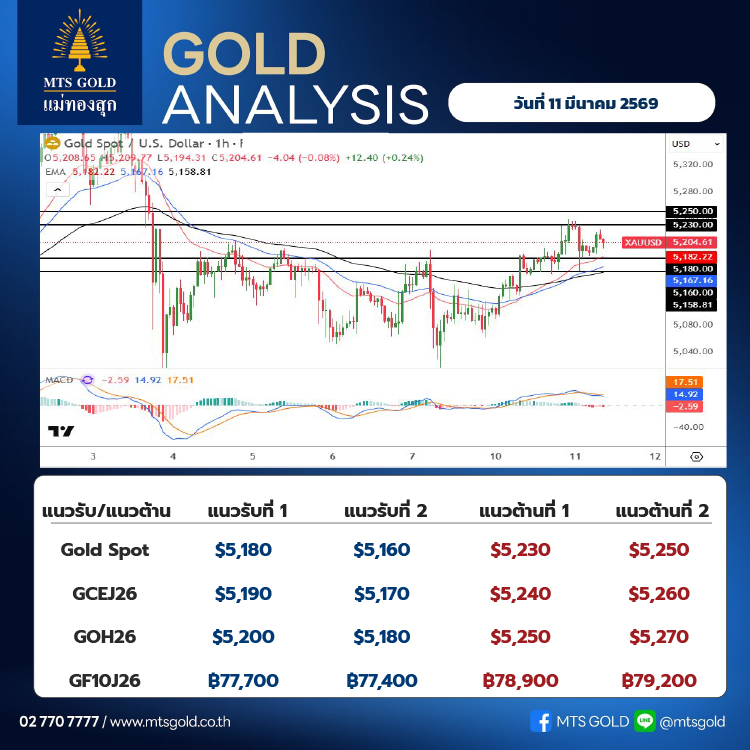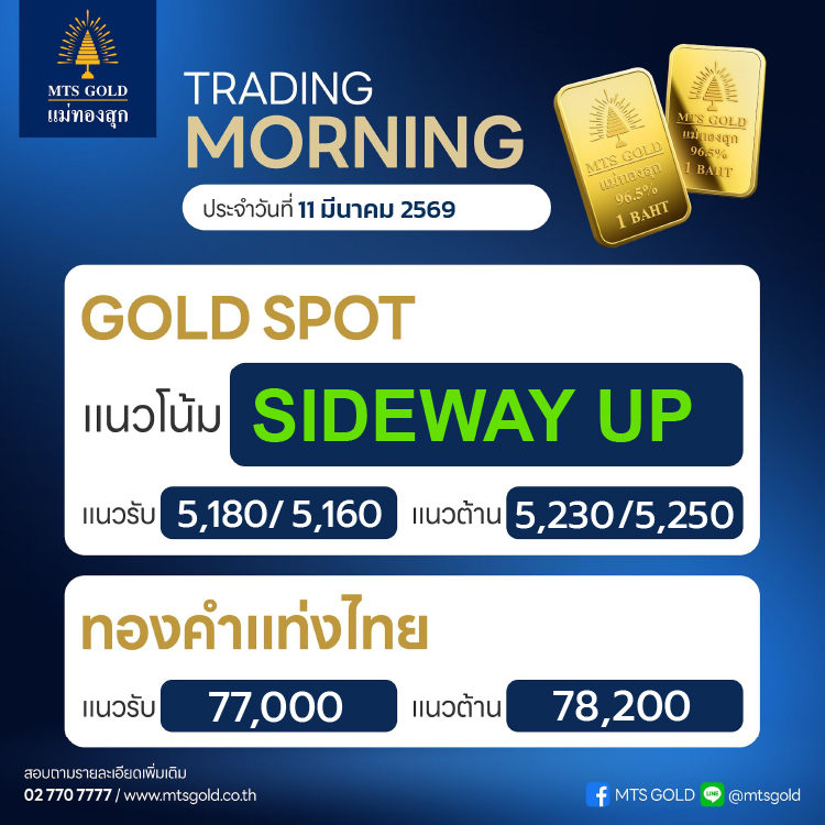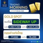 ประเมินกรอบระยะสั้นของราคาทองคำตลาดโลก (Gold Spot) แนวรับอยู่ที่บริเวณ 5,180–5,160 เหรียญ ขณะที่แนวต้านอยู่ที่ระดับ 5,230–5,250 เหรียญ ส่วน ทองคำในประเทศ (Thai Gold) ประเมินแนวรับที่ระดับ 77,000 บาท และแนวต้านที่ระดับ 78,200 บาท