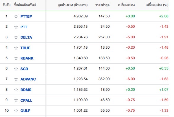 10 อันดับหลักทรัพย์ที่มีมูลค่าการซื้อขายสูงสุด