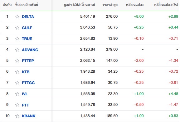 10 อันดับหลักทรัพย์ที่มีมูลค่าการซื้อขายสูงสุด