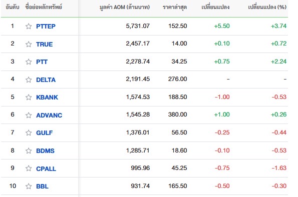 10 อันดับหลักทรัพย์ที่มีมูลค่าการซื้อขายสูงสุด