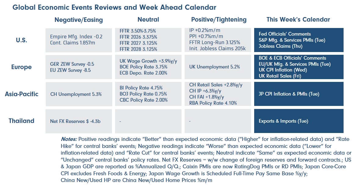 * ฝั่งไทย – ผู้เล่นในตลาดจะรอลุ้น รายงานยอดการส่งออกและนำเข้า (Exports & Imports) ในเดือนกุมภาพันธ์ ซึ่งอาจเริ่มสะท้อนผลกระทบของการดำเนินนโยบายการค้าของสหรัฐฯ ที่แม้จะมีการยกเลิกภาษีนำเข้า IEEPA โดยศาลสูงสุดของสหรัฐฯ (Supreme Court) แต่ทางการสหรัฐฯ ได้ประกาศใช้มาตรา 122 ในการขึ้นภาษีนำเข้ากับทุกประเทศในอัตรา 10% (เสี่ยงถูกปรับขึ้นเป็นอัตราสูงสุด 15%) เป็นระยะเวลา 150 วัน พร้อมทั้งเดินหน้าการสืบสวนสอบสวนเพื่อเตรียมขึ้นภาษีนำเข้าจากมาตรา 232 และ 301