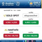 สมาคมค้าทองคำประกาศราคาทองวันนี้ (24 มี.ค.2569) ครั้งที่ 1 ปรับขึ้น 100 บาท เทียบกับราคาปิดเมื่อวานนี้