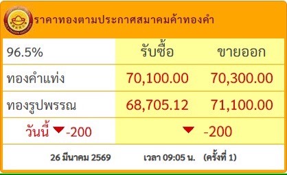 สมาคมค้าทองคำประกาศราคาทองวันนี้ (26 มี.ค.2569) ครั้งที่ 1 ปรับลดลง 200 บาท เทียบกับราคาปิดเมื่อวานนี้
