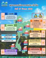 กรมอุตุนิยมวิทยา พยากรณ์อากาศ 24 ชั่วโมงข้างหน้า วันที่ 27 มี.ค.69 ประเทศไทยมีอากาศร้อนโดยทั่วไป กับมีฟ้าหลัวในตอนกลางวัน และมีอากาศร้อนจัดบางพื้นที่ในภาคเหนือ ภาคตะวันออกเฉียงเหนือ และภาคกลาง โดยมีฝนฟ้าคะนอง กับมีลมกระโชกแรงบางแห่ง เนื่องจากความกดอากาศต่ำเนื่องจากความร้อนปกคลุมประเทศไทยตอนบน ในขณะที่มีลมใต้และลมตะวันออกเฉียงใต้กำลังอ่อนพัดปกคลุมในบริเวณดังกล่าว ขอให้ประชาชนบริเวณประเทศไทยดูแลรักษาสุขภาพเนื่องจากสภาพอากาศที่ร้อนถึงร้อนจัด โดยหลีกเลี่ยงการทำงานหรือการประกอบกิจกรรมในที่โล่งแจ้งเป็นระยะเวลานาน รวมทั้งระวังอันตรายจากฝนฟ้าคะนองและลมกระโชกแรงที่อาจเกิดขึ้นในบางพื้นที่ไว้ด้วย