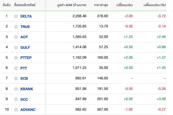 10 อันดับหลักทรัพย์ที่มีมูลค่าการซื้อขายสูงสุด