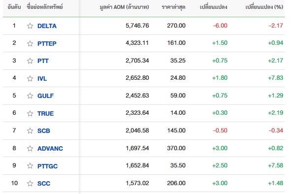 10 อันดับหลักทรัพย์ที่มีมูลค่าการซื้อตลาดหุ้นไทยปิดวันนี้ (30 มี.ค.69) บวก 2.57 จุด ดัชนี1,449.62 จุด