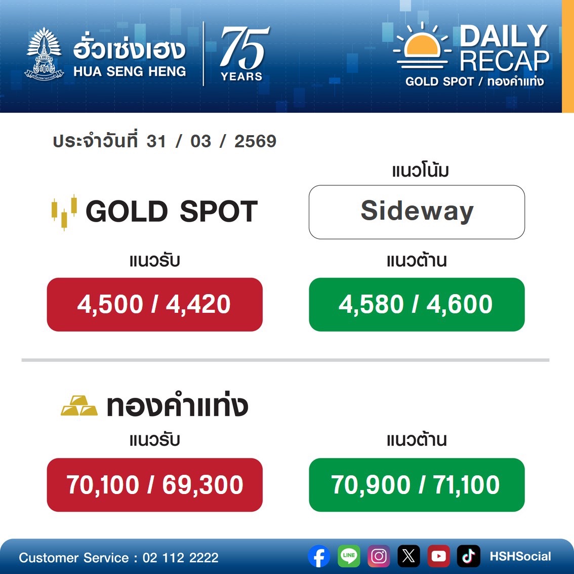 สมาคมค้าทองคำประกาศราคาทองวันนี้ (31 มี.ค.2569) ครั้งที่ 1 ปรับขึ้น 900 บาท เทียบกับราคาปิดเมื่อวานนี้