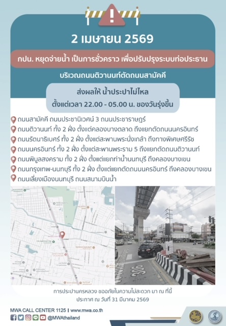 การประปานครหลวง (กปน.) ขอแจ้งให้ทราบว่า จะดำเนินการตามแผนปรับปรุงระบบท่อประธาน ในพื้นที่บริเวณถนนติวานนท์ตัดถนนสามัคคี เพื่อให้ประชาชนได้รับบริการน้ำประปาอย่างเพียงพอและทั่วถึง จึงมีความจำเป็นต้องหยุดจ่ายน้ำ เป็นการชั่วคราว ในคืนวันพฤหัสบดีที่ 2 เมษายน 2569 ตั้งแต่เวลา 22.00 - 05.00 น. ของวันรุ่งขึ้น โดยระหว่างดำเนินการ ส่งผลให้ น้ำประปาไม่ไหล ในพื้นที่ดังต่อไปนี้