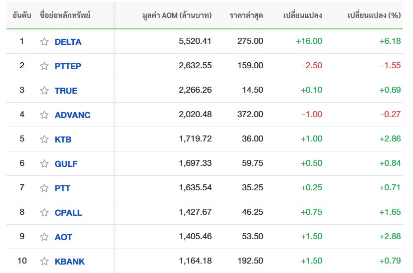 10 อันดับหลักทรัพย์ที่มีมูลค่าการซื้อขายสูงสุด