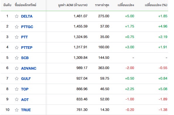 10 อันดับหลักทรัพย์ที่มีมูลค่าการซื้อขายสูงสุด